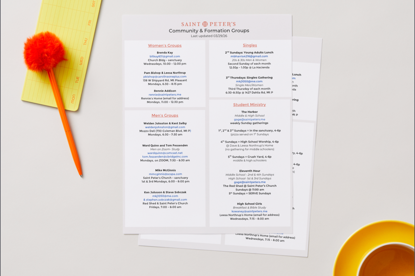 While Sundays are a great first step in the process of connection, they simply aren’t enough for us to see true transformation. We need other opportunities to build relationships with people who are learning to follow Christ. Because we are all in different places in our journey, Saint Peter’s offers several types of groups to help you connect and grow.